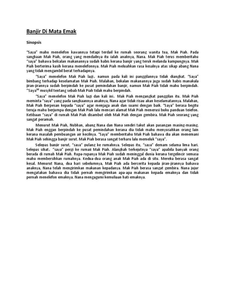 Berikutnya sinopsis, tema, persoalan, plot, watak perwatakan, latar, nilai, pengajaran, soalan cerpen. Saifullizan yahaya sinopsis cerpen ini mengisahkan mengenai seekor kucing yang diberi nama oren. Antologi tingkatan 1, 2, 3 (cerpen, sajak. Banjir di mata emak (che soo ismail) sajak: Menuai emas (salina ibrahim) sinopsis. Sinopsis cerpen banjir di mata emak. Cerita berkisar pada watak "saya" yang hendak menelefon temannya tetapi tersalah tekan nombor telefon rumah mak piah. May 16, 2020 · 8:00 pg antologi tingkatan 2, cerpen 16 comments kupasan cerpen: Cerpen banjir di mata emak (k) cerpen talia dan raksasa qadqad (k) pantun alam remaja (k) pantun kiasan (k). Cerpen banjir di mata emak ialah komsas tingkatan 2.