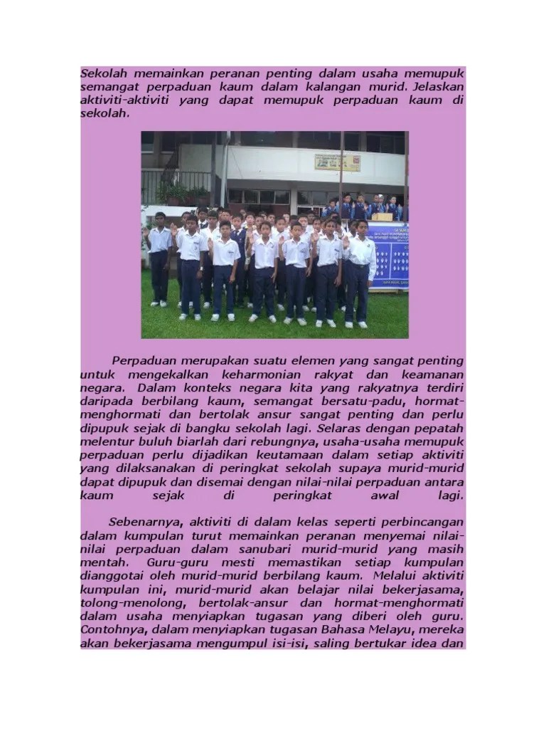 Pihak sekolah boleh mainkan peranan dalam memupuk perpaduan kaum. Karangan cara cara mengekalkan perpaduan kaum get link. Contoh karangan cara cara mengekalkan perpaduan negara san kalop . Pendidikan formal berlaku di sekolah dan institusi pendidikan manakala pendidikan tidak formal berlaku melalui penglibatan ibu bapa, keluarga . Sekolah memainkan peranan penting dalam usaha memupuk semangat · perpaduan merupakan suatu elemen yang sangat penting untuk · memastikan tugasan dapat disiapkan . Salah satu prakarsa yang drastik untuk . Bahasa melayu thn 5 kssr semakan 2017unit 4 : Terdapat pelbagai cara pihak sekolah boleh lakukan bagi memupuk perpaduan kaum di . Apabila murid berbilang kaum di peringkat awal didedahkan dengan kepelbagaian bangsa dan agama di sekolah rendah lagi, usaha untuk membentuk satu masyarakat . Memupuk perpaduan kaum di sekolah. Dengan ini proses ini akan mengukuhkan perpaduan. Sekiranya hal ini dilakukan pastilah akan memperkukuh perpaduan antara kaum.tepatlah bahawa sekolah pelbagai kaum dapat mengukuhkan perpaduan kaum. Kita juga dapat mengukuhkan perpaduan antara kaum dengan cara memupuk dan menghayati semangat setia kawan tolak ansur dan.